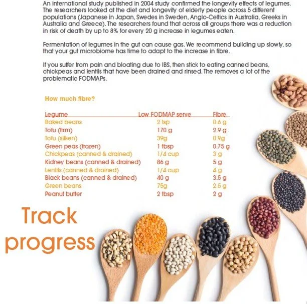 Track your fibre intake (build up slowly to 28g/day). If diarrhoea is an issue, focus on soluble fibre, if constipation is a problem you’ll need both soluble and insoluble fibre. Use our Best Ever Poop Plan ebook to guide you on sources of both, and use the tables with the fibre content of different foods. Just tracking for a few days each month will give you an idea or where you can get some easy wins. Long term food tracking probably does more harm than good.