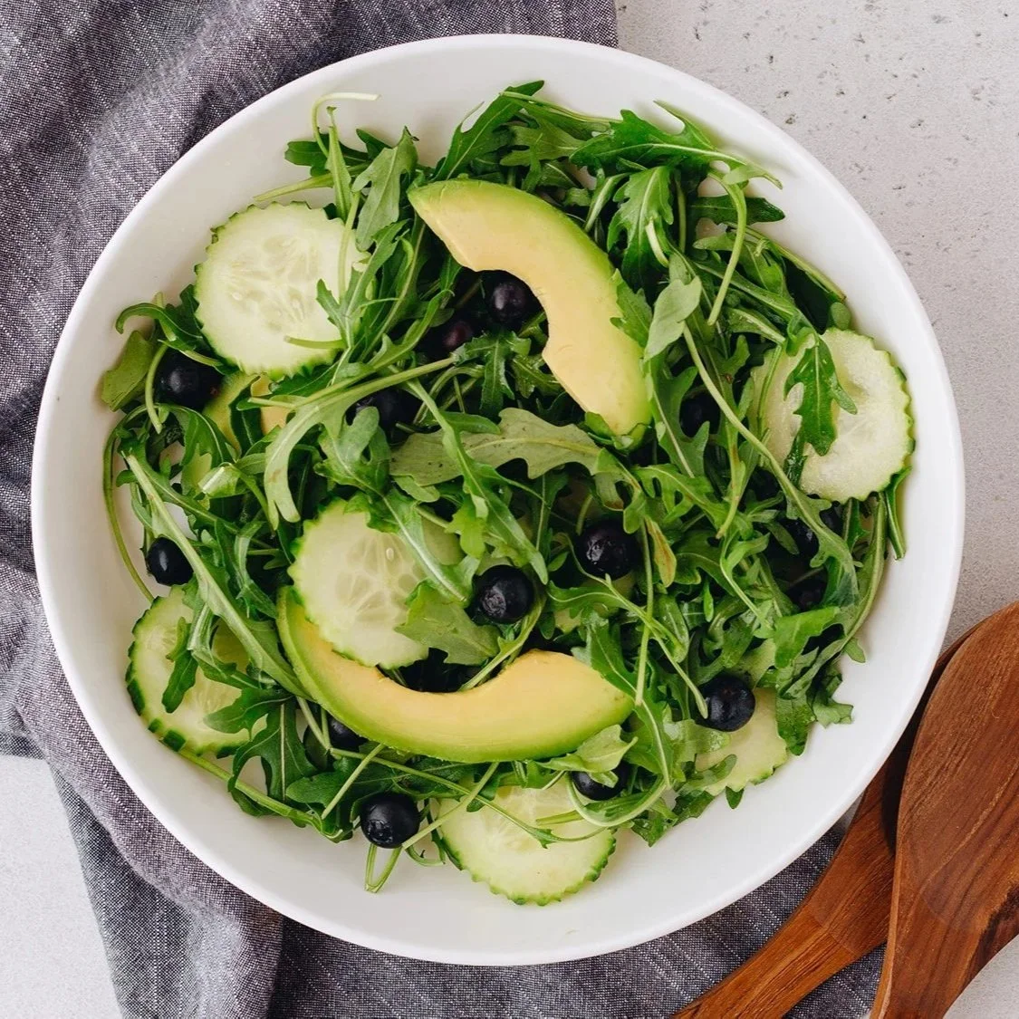 Choose a leaf and mix with the cucumber for a crisp, cooling salad. Adding a little avocado and blueberries takes it next level in our pretty green salad.