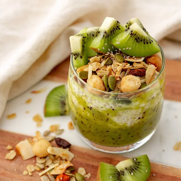 They’re delicious on their own, blended into smoothies, or added to lactose‑free yoghurt bowls. You’ll find kiwifruit featured in several breakfast‑friendly ideas including our chia pots and kiwi vanilla glow smoothie.