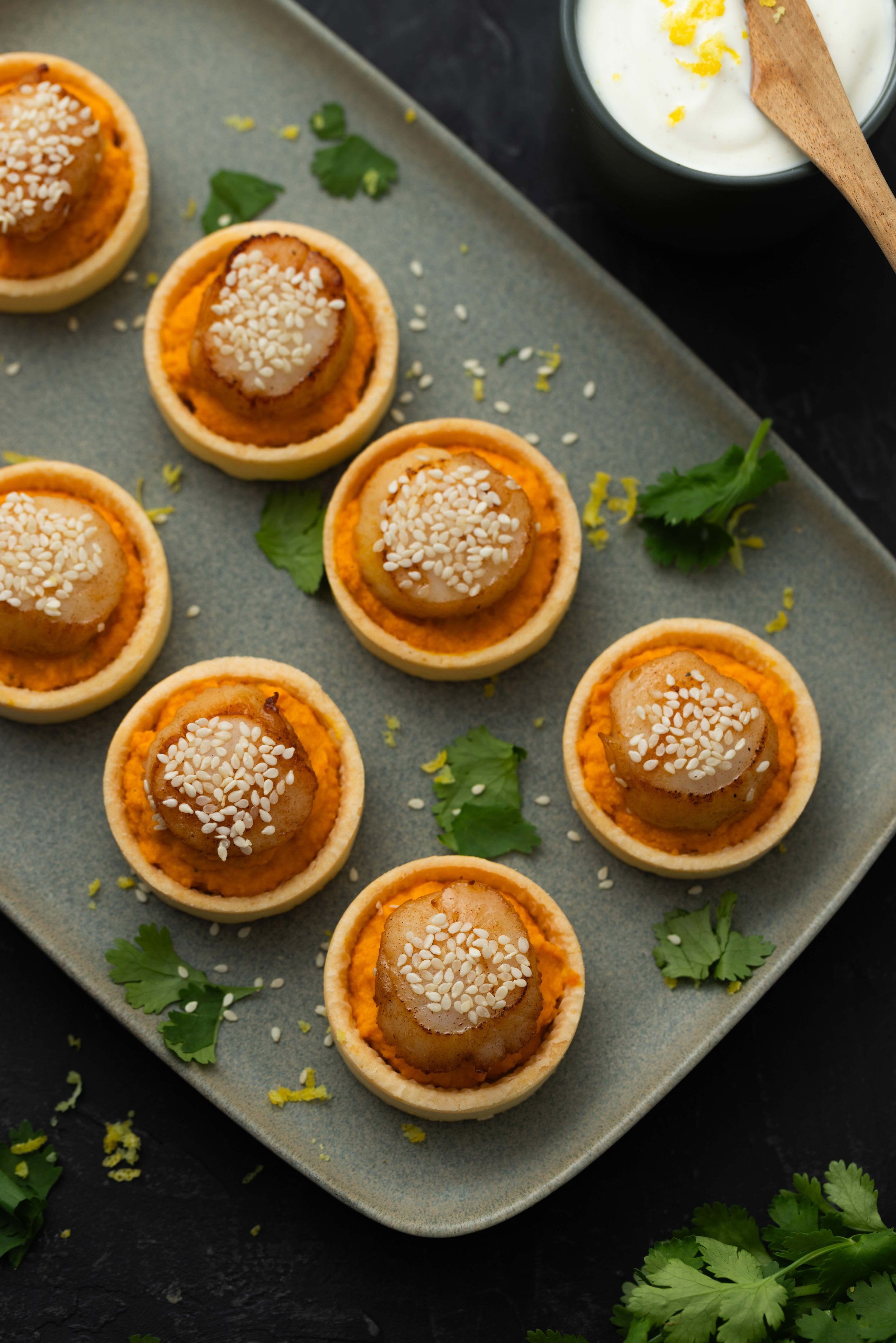 Looking for a fancy canapé that no-one will suspect is low fodmap? These scallop tartlets are perfect, served with champagne or white wine at your next function. Find gluten-free pre-baked tartlet shells at your local independent grocer. What I love about this tartlets is that that you can pre-prepare the carrot puree and the yoghurt dressing, leaving only the scallops to cook once your guests arrive. They literally come together in just minutes. This makes 24 tartlets (but you can scale up and down depending on how many scallops and tartlets you can procure).