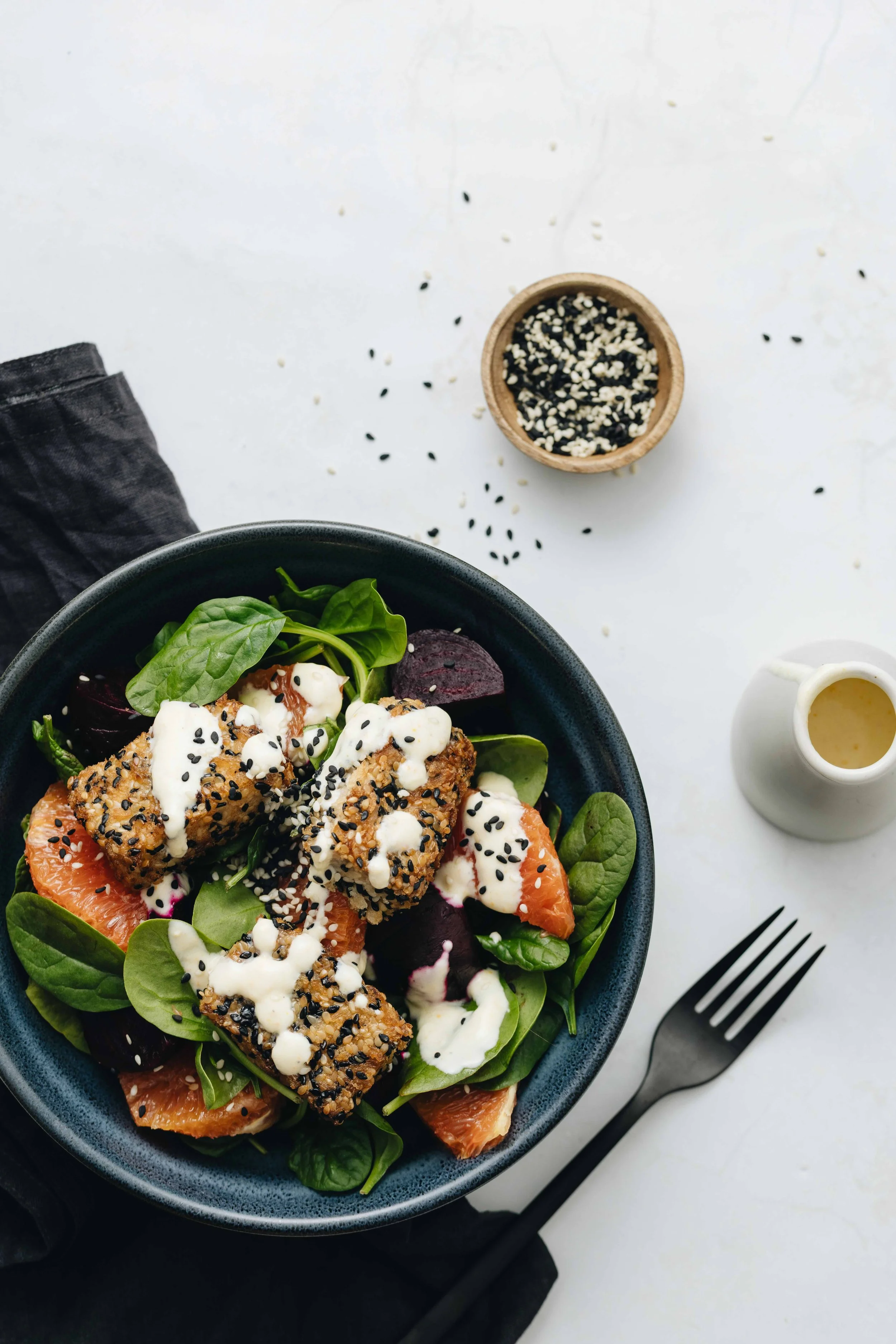 A vibrant salad featuring crunchy sesame crusted tofu topped with an orange yoghurt dressing. This recipe balances flavours but also fructans (found in tofu, cornflour, panko breadcrumbs, sesame seeds, orange zest, beetroot and baby spinach) and fructose (found in oranges and orange juice). The tofu crust is crispy and delicious and the zesty dressing brings everything together.