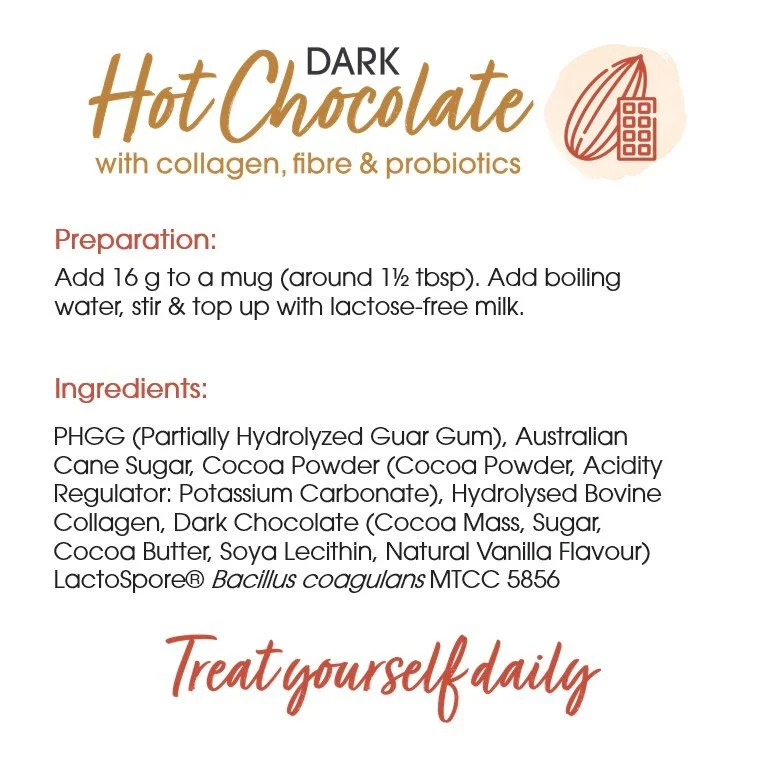 PHGG (Partially Hydrolyzed Guar Gum), Australian Raw Cane Sugar, Cocoa Powder (Cocoa Powder, Acidity Regulator: Potassium Carbonate), Hydrolysed Bovine Collagen, Dark Chocolate (Cocoa Mass, Sugar, Cocoa Butter, Soya Lecithin, Natural Vanilla Flavour) LactoSpore® Bacillus coagulans MTCC 5856